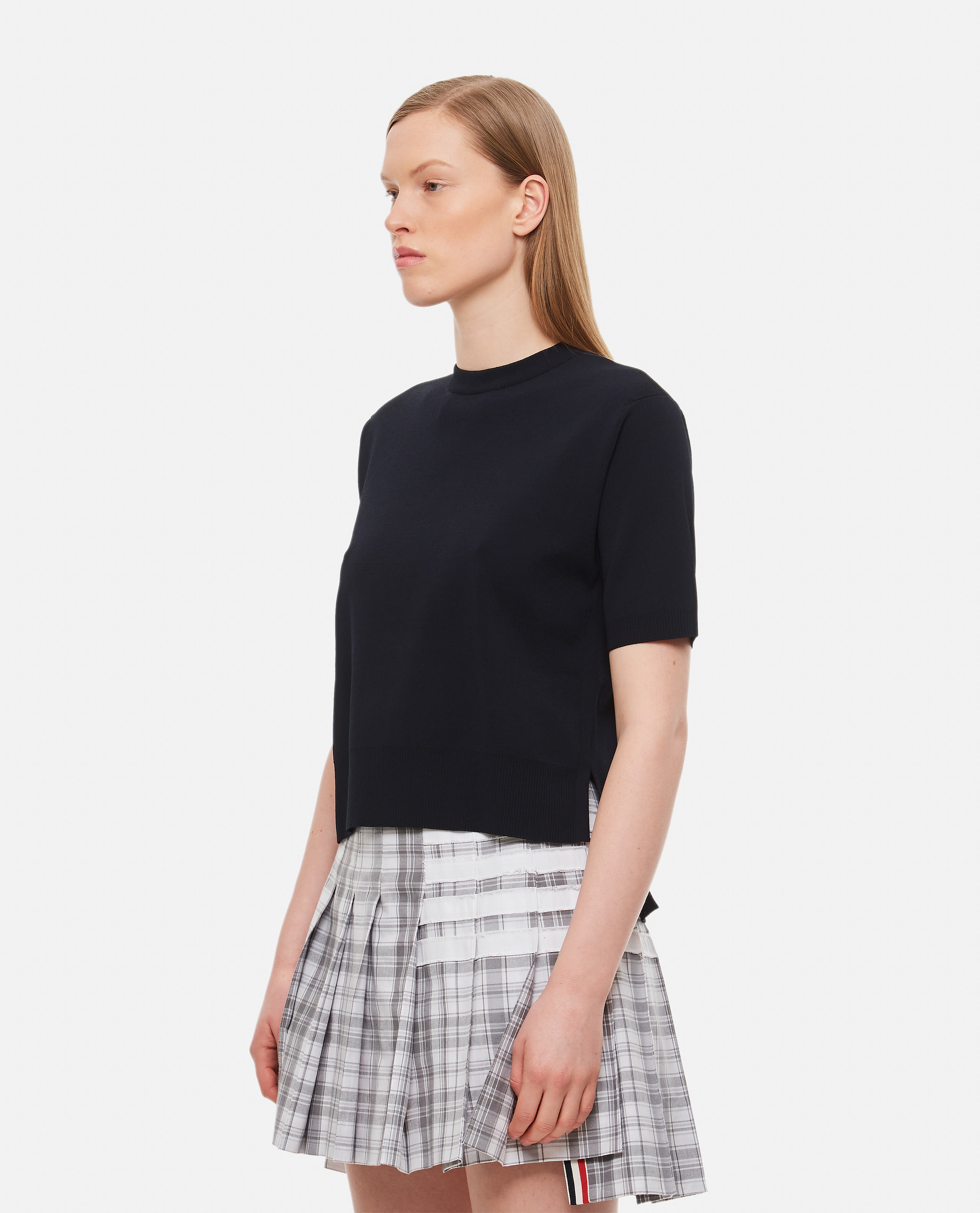 Crewneck. Rwb intarsia stripe at back. Boxy fit. Color: navy blue.