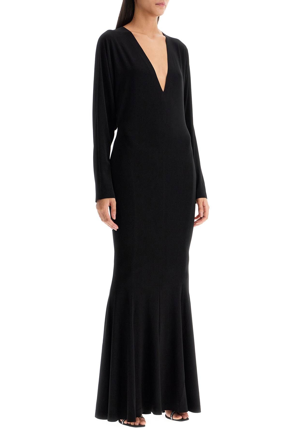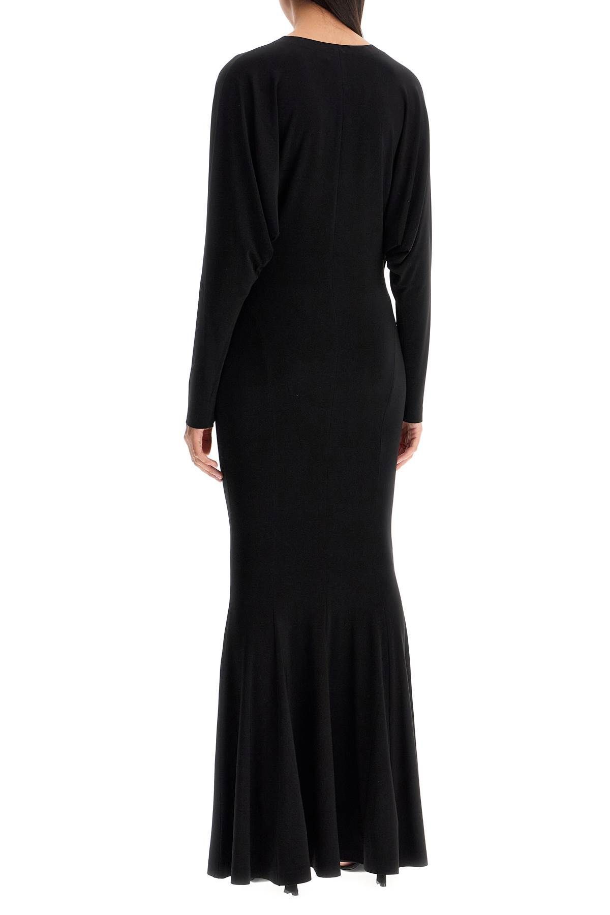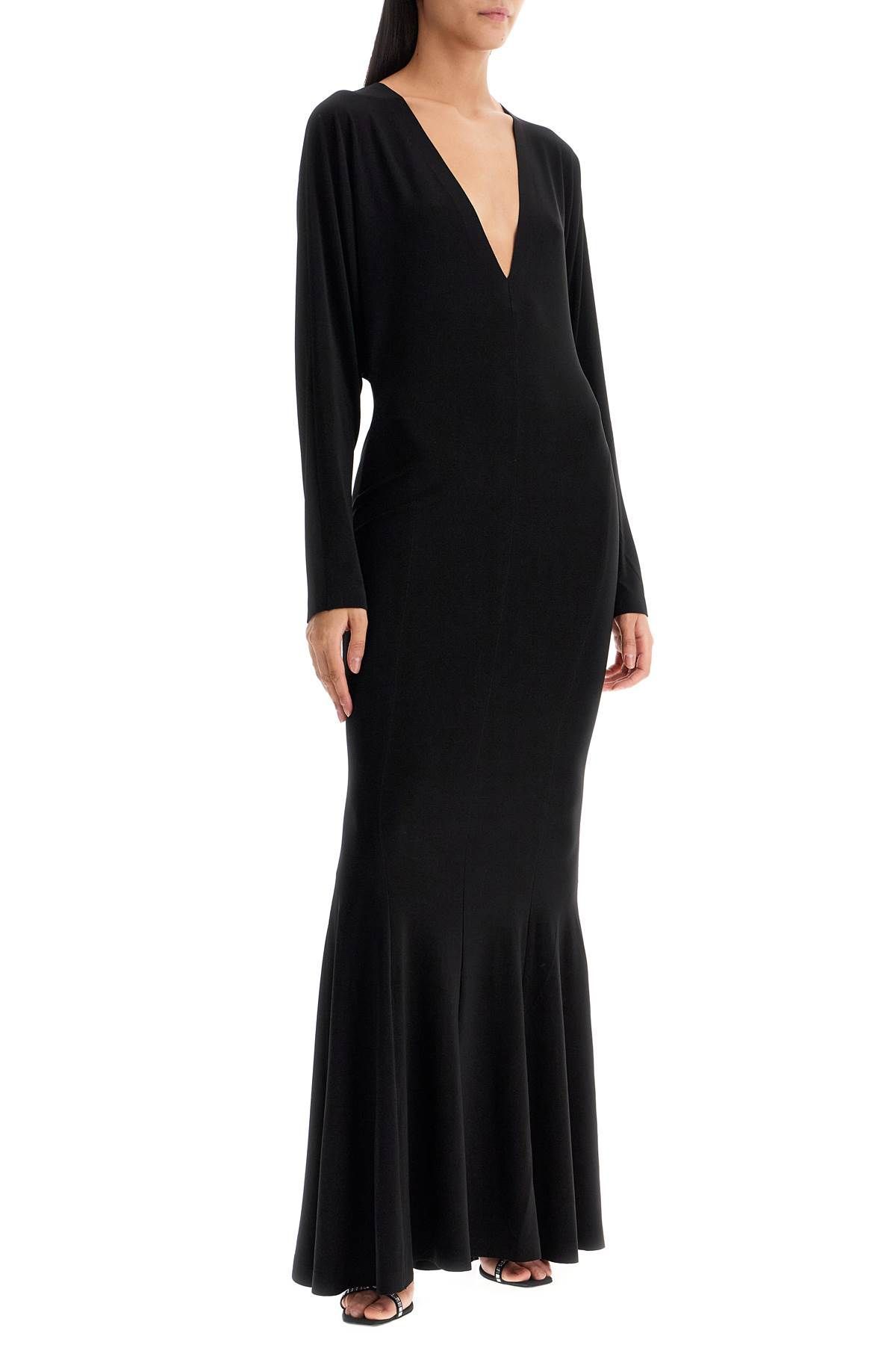 Norma Kamali presents a long mermaid dress in poly lycra with a deep V-neckline