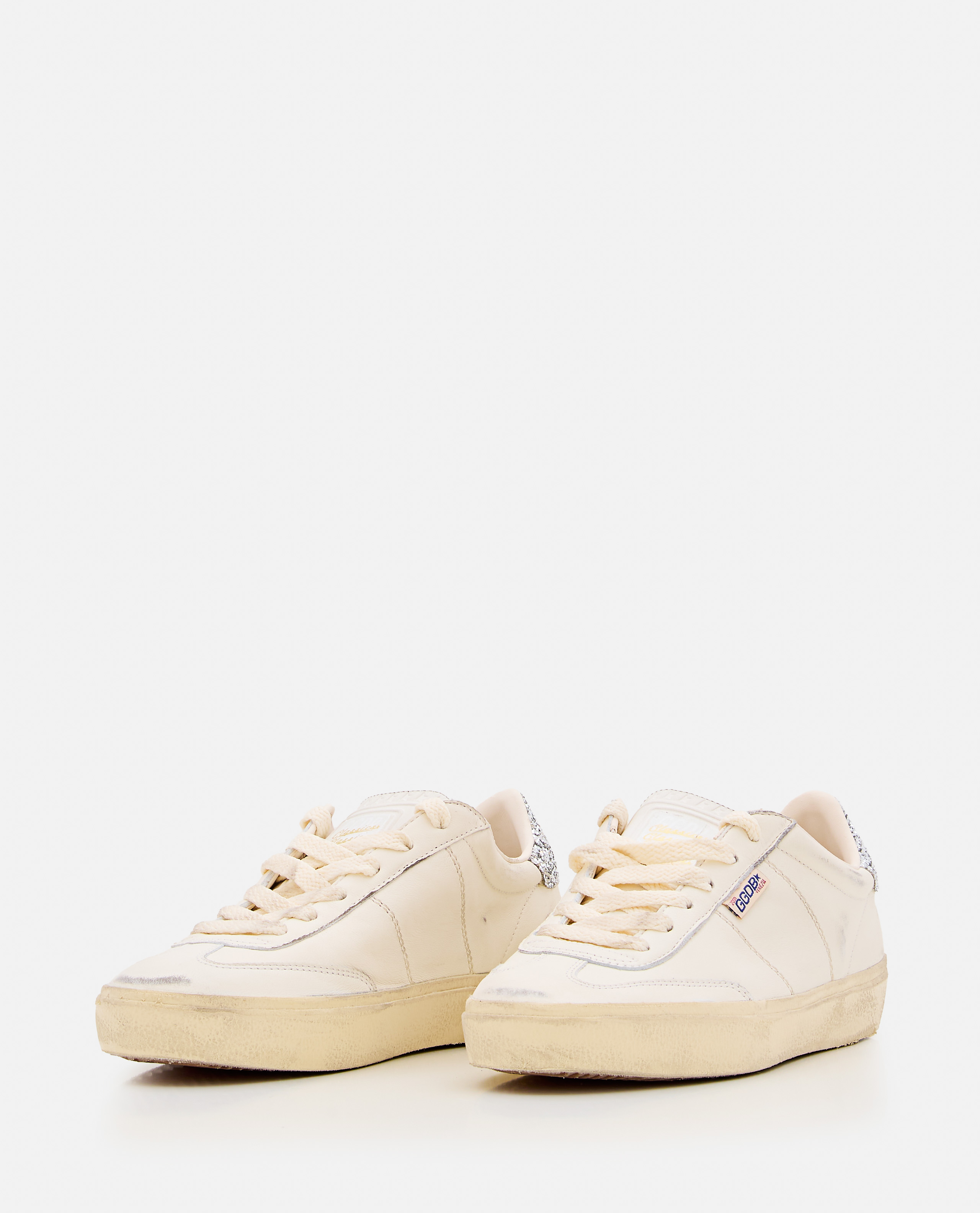 Front lace-up closure.Leather upper.Rubber sole.Gold metal letting logo.Silver glitter heel tab.Color: white.