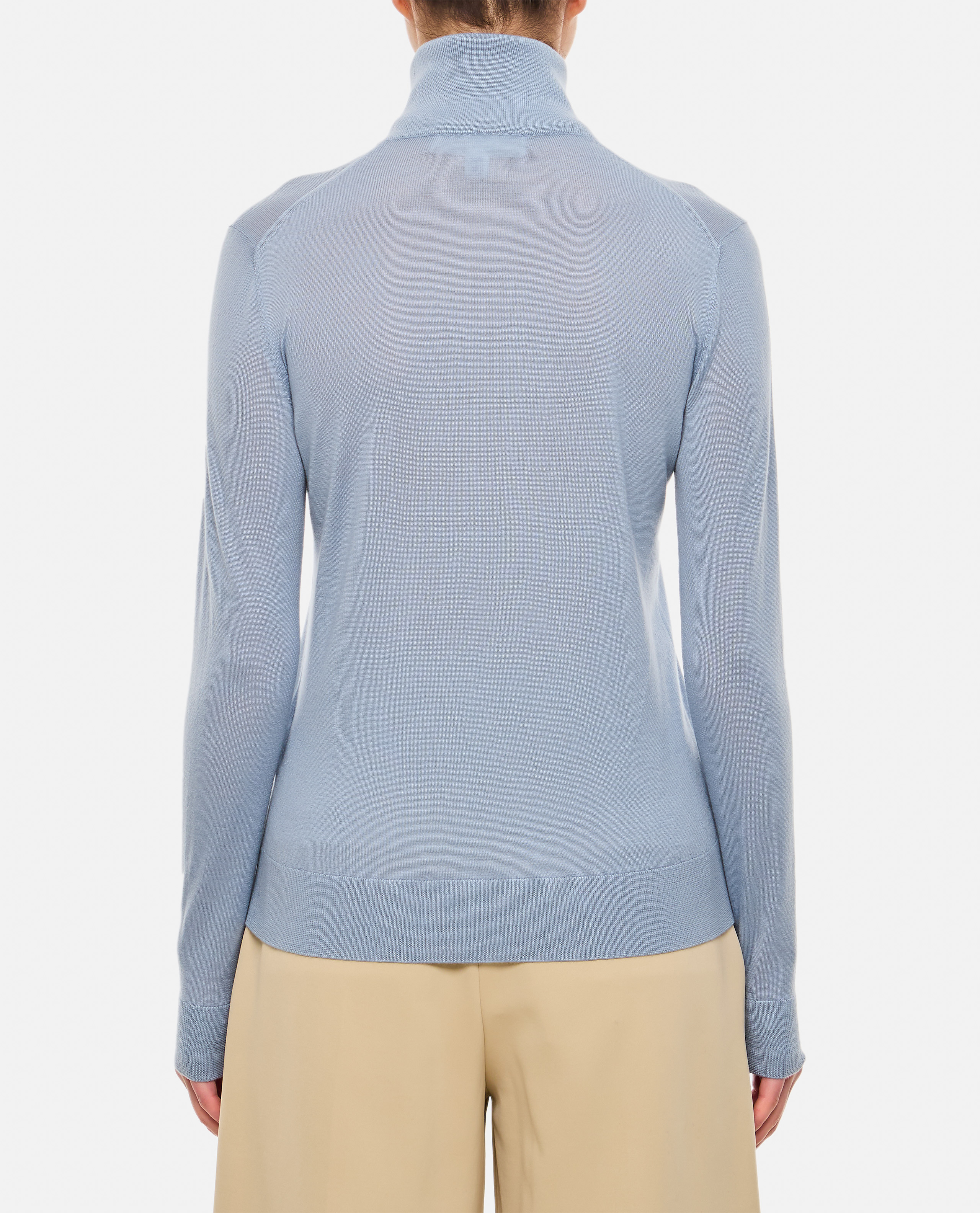 Turtleneck. Ribben collar, hem and cuffs. Slim fit. Color: light blue.