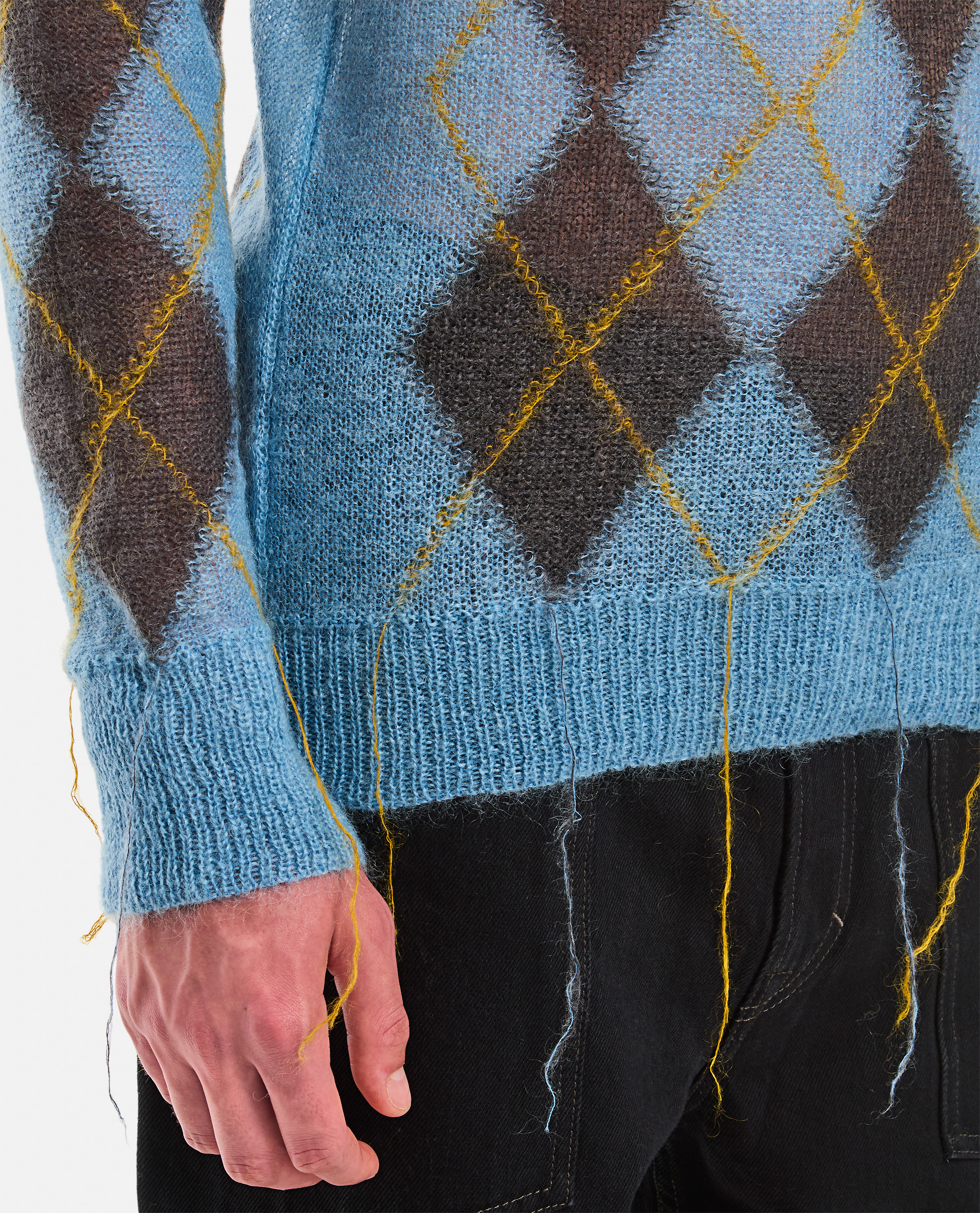 V Neck.Ribbed cuffs and hem.Argyle pattern.See-trough effect.Color: light-blue.
