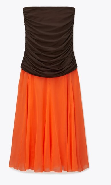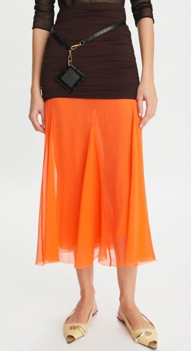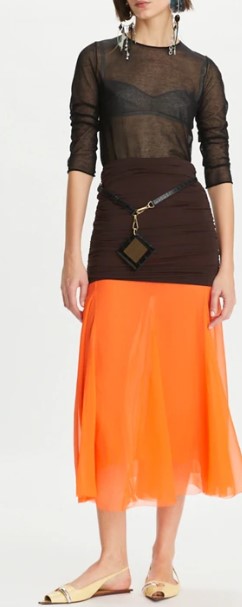 High waisted.Fitted top part with flowy pleated bottom.Ankle length.Zip-up closure.Color: orange.