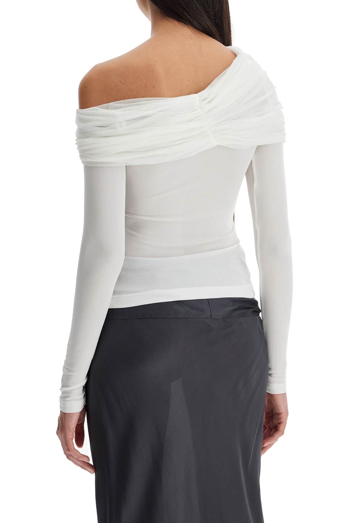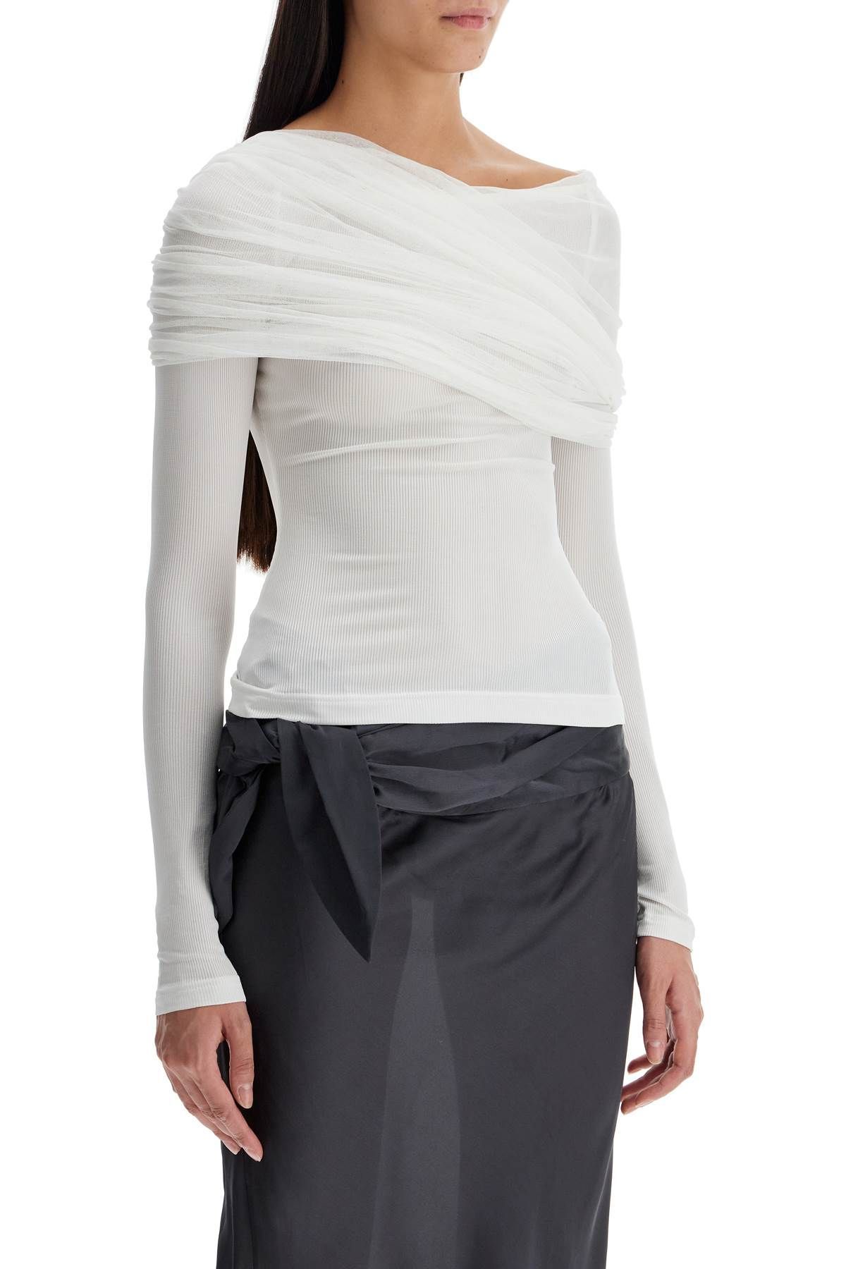 This long-sleeved top by Christopher Esber is made of ribbed viscose jersey and features an off-shoulder neckline with a draped tulle panel in the same tone